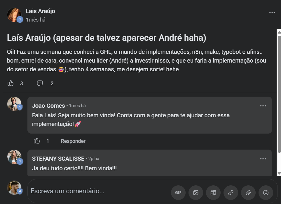 "Em 2 semanas, eu saí do zero e já consegui estruturar muito bem os fluxos e entender a ferramenta. E, basicamente, isso só foi possível por todo o auxílio que recebi dentro do grupo."