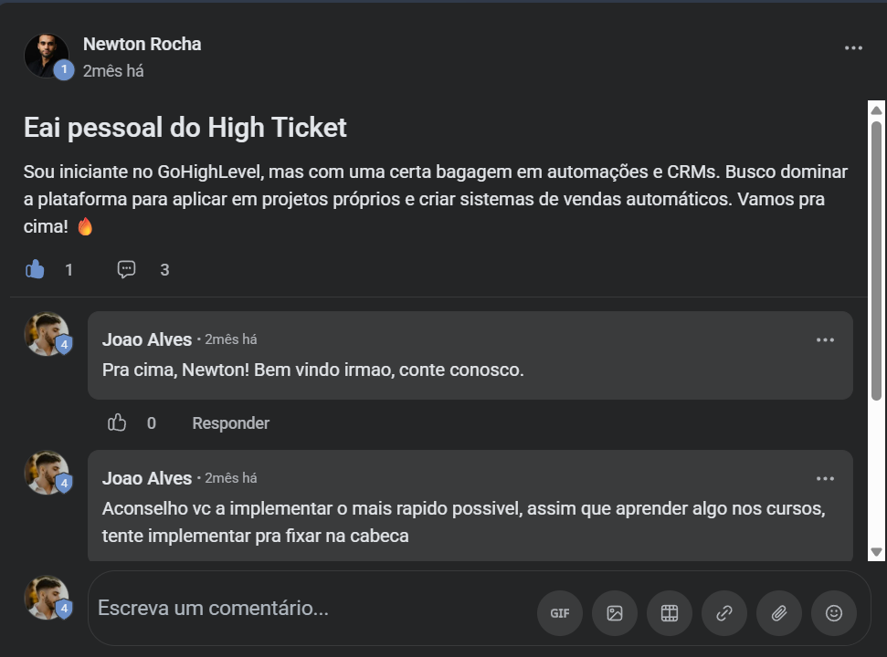 "Quando conheci o GHL, fiquei impressionado, porém receoso pelo fato de ser uma plataforma americana com suporte internacional. Mas, ao assistir o vídeo do João e do Gabriel, me senti confiante. Se você está em dúvida sobre entrar no High-Ticket Clube, eu garanto que vale a pena."