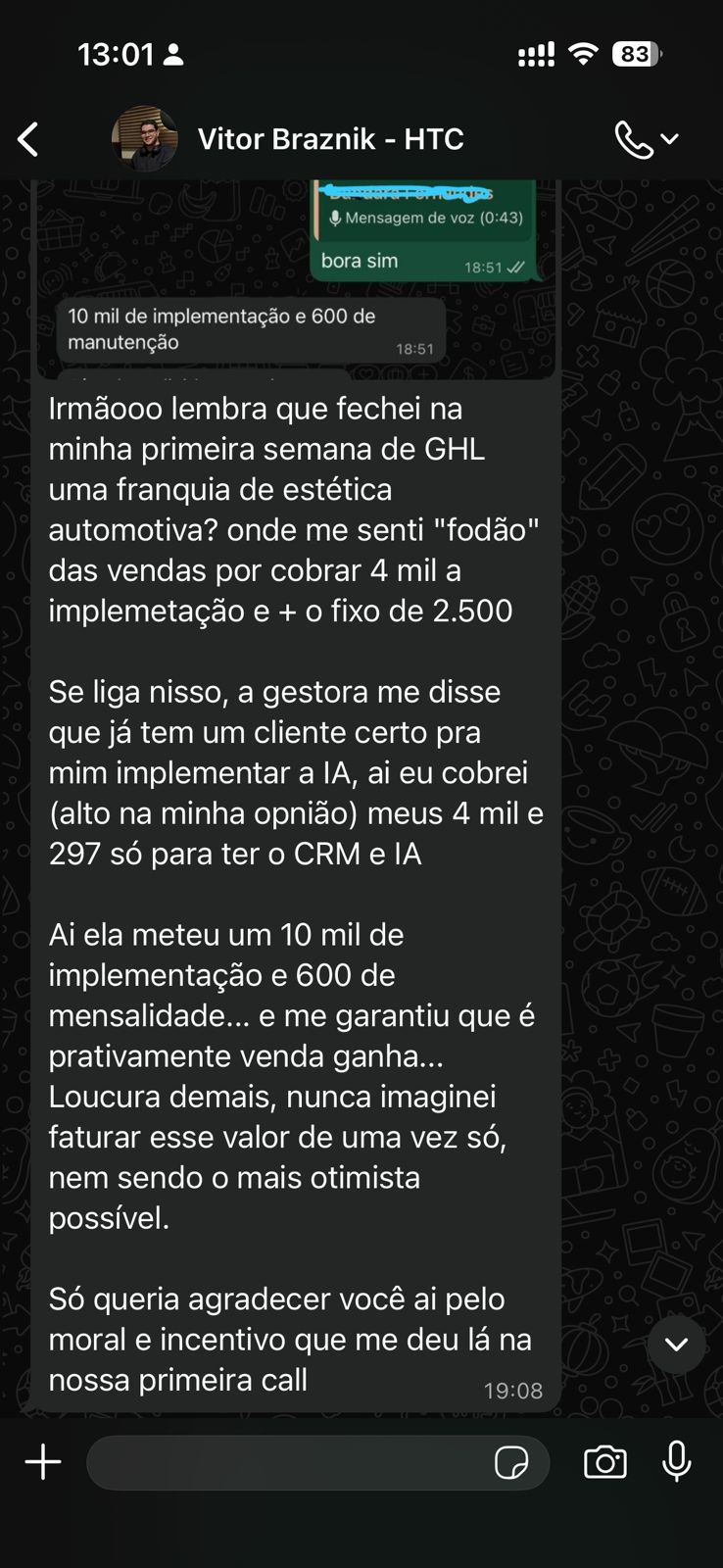 Fechei com uma clinica de visibilidade nacional por 1500 reais de implementação e 500 reais de recorrência, mas agora, depois dessa call, sei como montar a oferta e precificar de uma forma que eu consiga mostrar o meu produto com valor e que aquilo vale o que eu estou pedindo